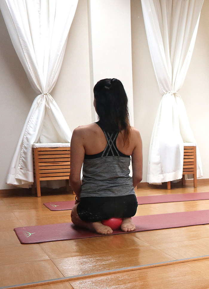 ①正座をし、ストレッチボールやクッションなどをお尻とかかとの間に挟みます。両足の親指はくっつかないよう、できるだけ足の裏は平行に。