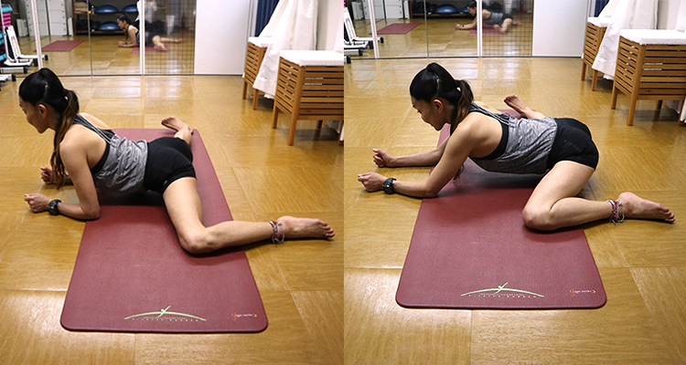 ②ゆっくりと膝を伸ばしていきましょう。膝の曲げ伸ばしを繰り返します。できるだけお尻の位置をかかとの上にもっていくように意識して。これも8〜10回を目安に。