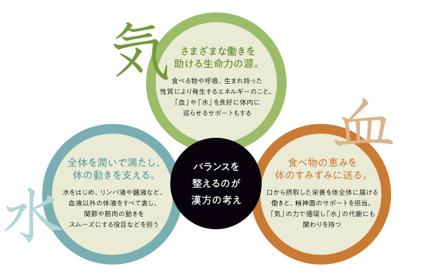 【気(き)・血(けつ)・水(すい)】を、身体を支える三つの柱とする漢方医学では、気象変化による関節痛の多くは【血】【水】が原因であると考えます。