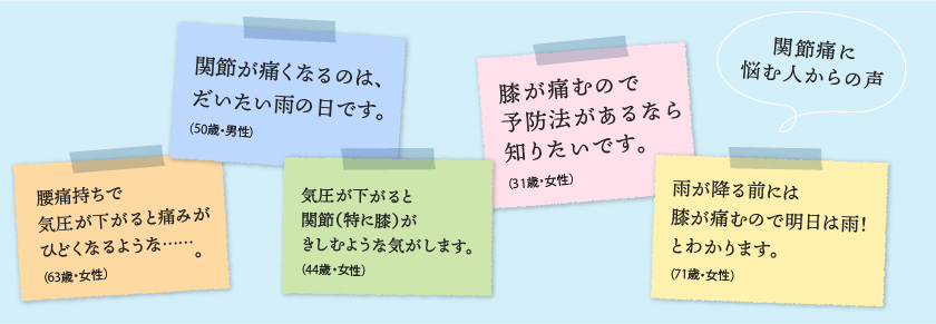 雨や台風の日、季節の変わり目などに、さまざまな不調が現れる“気象病”。私たちには、気圧や気温、湿度などの変化に合わせ、体温を調整するなど身体をコントロールする働きがあります。それは身体を守るための自律神経の働きですが、過剰になると、不調が現れてしまいます。代表的な不調は、頭痛やめまい、気分の落ち込みに加えて、関節痛もそのひとつに挙げられます。ロート製薬が行ったアンケートでも、「雨が降ると膝が痛む」などお悩みの声が多く寄せられました。