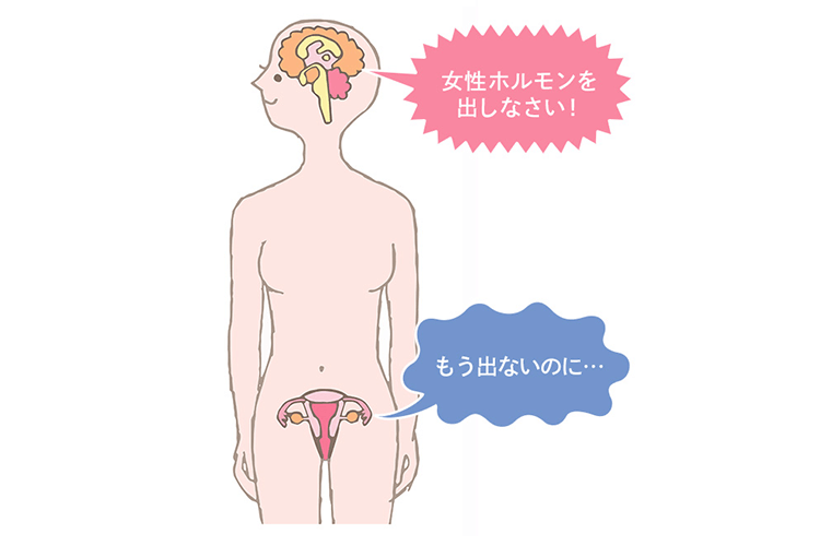 それなのに、脳は今まで通りに「女性ホルモンを出しなさい」という指令を卵巣に送ります。でも、機能が低下した卵巣は力がないので出すことができない。すると脳は、「どうして出さないの?」とさらに強く指令を出します。この指令を出す脳の下垂体という部分は、自律神経を管理している視床下部という部分のすぐ隣。「出しなさい!」と強く指令を出すうちに、隣にある自律神経の中枢が影響を受けることで、ホットフラッシュなどの症状が出てしまうのです。