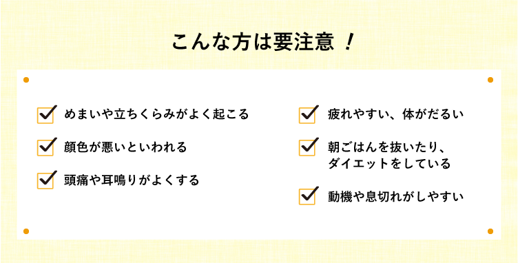 なんとなく体調が優れない、すぐに疲れてしまうなどの症状は、鉄欠乏性貧血が原因の可能性もあります。私たちは呼吸することで酸素を取り入れ、酸素は血液中のヘモグロビンに含まれる鉄によって全身に運ばれていきます。鉄が不足すると、十分な酸素を身体のすみずみに届けることができず、体の中は酸欠状態になり、さまざまな不調を感じやすくなるのです。