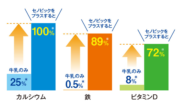 ※ (牛乳*+セノビック)コップ1杯で1日あたりの栄養素等表示基準値に占める割合を示しています。