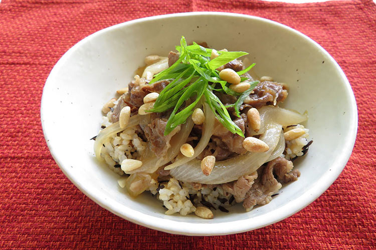 - 4.どんぶりにご飯を盛り、③をのせて松の実をちらし、ねぎを天盛りにする。