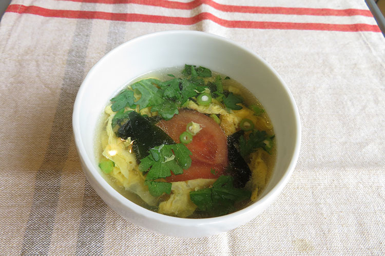 - 4.器にくし型のトマト2個とわかめを入れ、スープも注ぎ入れる。