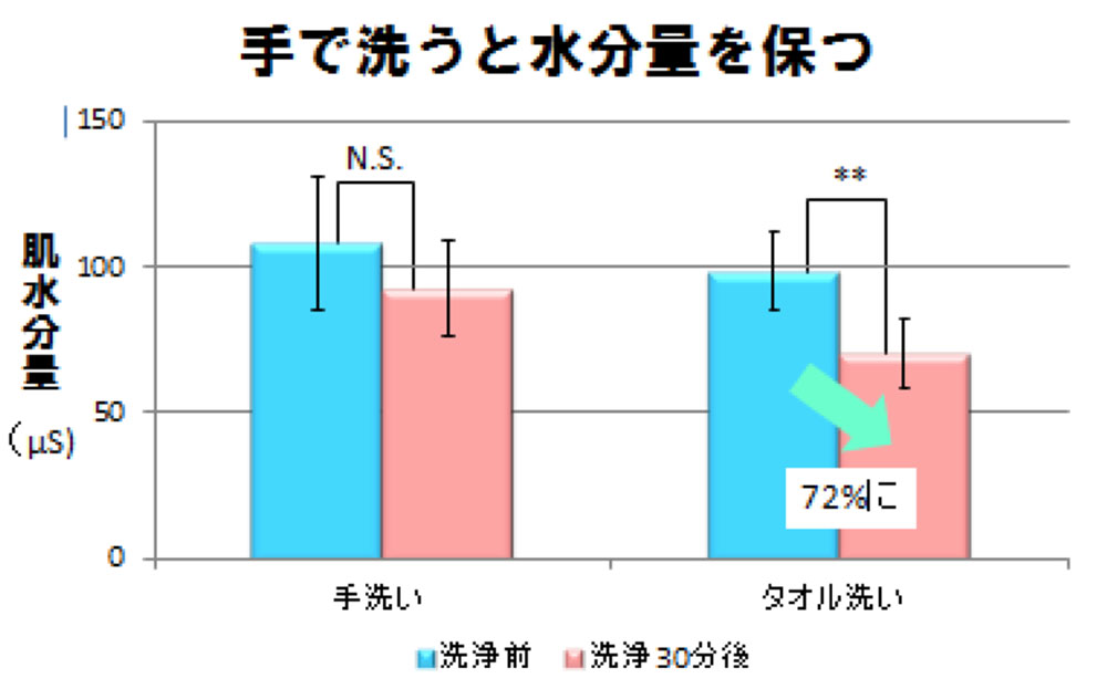 まず気を付けたいのが、洗い方。洗い方ひとつで、肌のうるおいは変わります。実際に手で洗った時と、タオルを使って洗った時の肌の水分量を調べたところ、タオル洗い後は水分を失い、手洗い後は水分をキープしていたのです。大切な肌の水分を守るために、ゴシゴシこすらず、ぜひ手でやさしく洗ってあげてください。基本的には、顔と体は同じお手入れで大丈夫です。