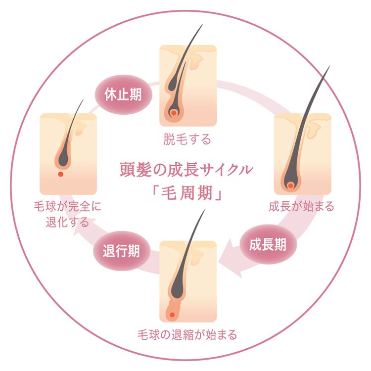 正常な頭髪は、「成長期」でどんどん毛が伸びて「退行期」で成長が止まり毛球の退縮が起こり、最後の「休止期」で全く動かなくなり、次の毛がまた出てくるタイミングで毛が抜けるというサイクルをたどっています。