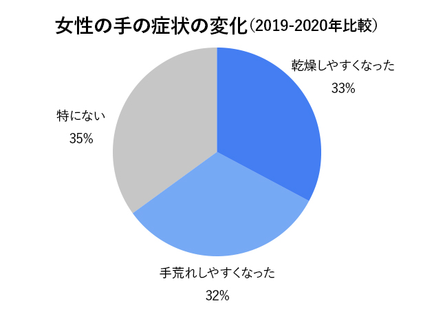 ロート製薬の調査によると、昨年と比較して「手洗い」「消毒液」の頻度が高くなった方はそれぞれ約6割*1もいます。さらに手の症状として「乾燥しやすくなった」「手荒れしやすくなった」と感じている方は約5割*1も。特に女性ではその傾向が高く、約6割の方が乾燥や手荒れに悩んでいることが分かりました。