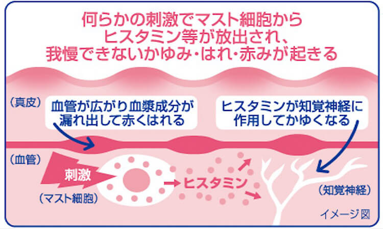 普段は白血球の一種であるマスト細胞に抱え込まれているヒスタミンが、何らかの刺激によって血液中に出てきてしまうとかゆみが発生。その部分の血管がはれるので皮膚が赤く見え、はれた血管のすき間から水分(血漿)が漏れ出して膨らむのではれが起きるのです。