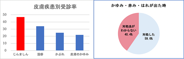 皮膚のトラブルはいろいろありますが、ロート製薬の調査によると、じんましんの受診率は、湿疹やかぶれなどに比べてかなり高い※2ことが明らかに。