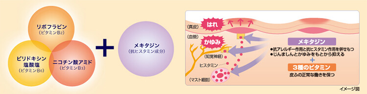 飲み薬の「ジンマート錠」は、あちこち広がったじんましんに体の中からアプローチ。有効成分「メキタジン※4」を配合しています。抗ヒスタミン作用と抗アレルギー作用を併せ持つメキタジンが、かゆみを元から抑え、さらに、疲れやストレスを意識した3種のビタミン※5が皮膚の正常な働きを保って、じんましんを鎮めます。
