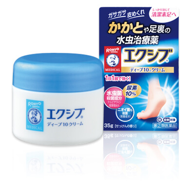 ガサガサかかとが水虫によるものであった場合は、保湿だけでは治りません。水虫薬を使って治療しましょう。かかとや足裏のガサガサ水虫は、角質層が他の部位よりも厚く薬が浸透しにくいため、しっかり治療することが必要です。「エクシブ Wディープ10クリーム」は尿素を10%配合。硬くなったかかと、足裏を柔らかくし、有効成分が浸透しやすい皮膚状態にします。抗真菌剤が角質層の深部までして、水虫菌を殺菌します。