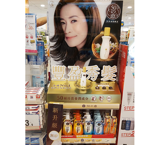販売店にヘアケア市場のポテンシャルを丁寧に説明し続け、やっと「50の恵」が香港の店頭に並び、お客様に手にとっていただけるようになったのです。