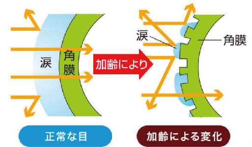 歳を重ねるごとに代謝機能は低下していきますが、それは目も同じこと。新しい細胞が生まれにくくなり、目の表面の角膜がデコボコの状態になってしまいます。すると涙が均一に広がらず、目に入ってくる光が乱反射してしまうため、物が見えづらくなり、目が疲れやすくなります。