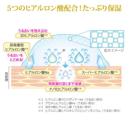 *:ヒアルロン酸Na、スーパーヒアルロン酸(アセチルヒアルロン酸Na)、ナノ化ヒアルロン酸(加水分解ヒアルロン酸)、肌吸着型ヒアルロン酸(ヒアルロン酸ヒドロキシプロピルトリモニウム)、3Dヒアルロン酸(ヒアルロン酸クロスポリマーNa)