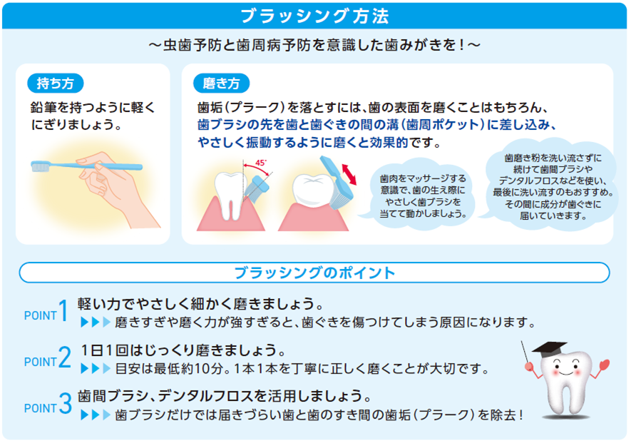 「ハレス ハミガキ」は歯を磨いている間中、成分がしっかりと歯ぐきに届くように作られています。薬用成分を歯ぐきに届かせながら磨けるので、じっくり時間をかけていただきたいですね。製品にも書いていますが、1日1回10分以上の歯磨きをオススメしています。その際は、以下に記載されている正しいブラッシング法を参考にしてくださいね。