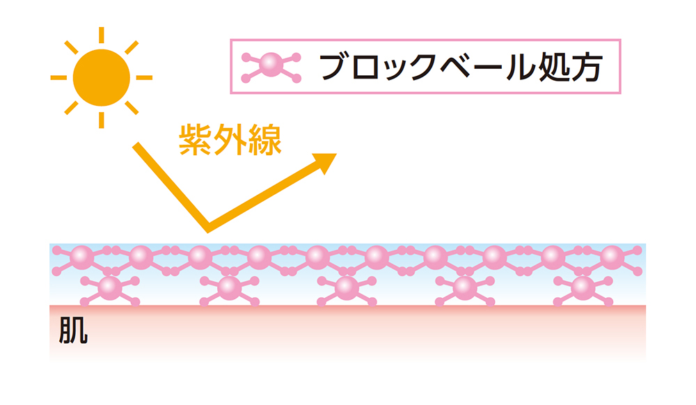 ブロックべール処方は、製剤に含まれる水と油をなじみやすくし、肌の上で均一な膜をつくることができます。