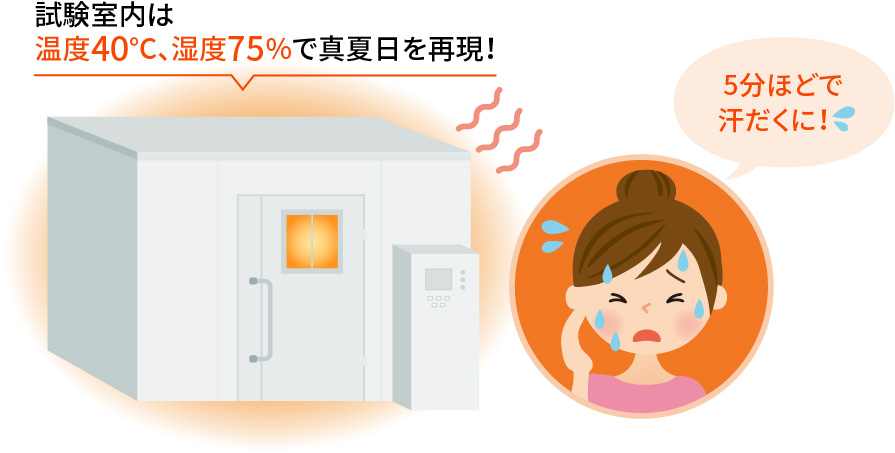 最近の日本の真夏は、気温が40℃に届きそうな日もめずらしくありませんよね。そのうえ、湿度が高いのはいつものこと。実際多くの方がそんな環境下で通勤していて、私自身、会社に行くだけで朝から汗だくになることがよくあります。そんな時でも気持ちよく使えるようにと作ったこのアイテムが、本当に快適な使い心地になっているのか、試験室を猛暑日を想定した気温40℃、湿度75%という高温多湿な環境にしてテストを行いました。