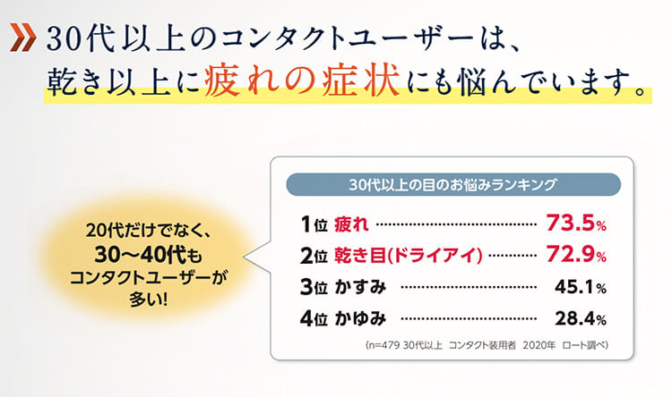 確かに、コンタクトレンズユーザーの方には主に“乾き”をケアする目薬をお届けしてきましたが、30代・40代の方に現れる様々な目のお悩みには応えられていない。それがわかったことで、研究をさらに進めることになりました。