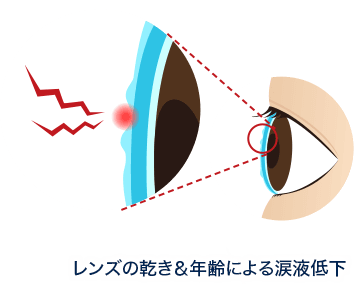 “目の乾き”は、年齢を問わず、多くのコンタクトレンズユーザーが悩まされやすい症状ですが、目の酷使や加齢による乾燥が重なると、さらに涙が不足しがち。涙液が不安定になって疲れやかすみを引き起こします。