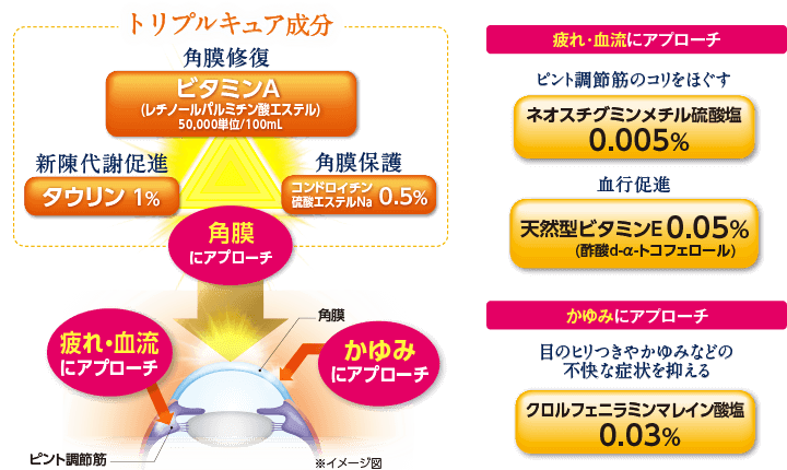 まず、軸として一番に着目したのが、傷つきやすいのに修復されにくくなって蓄積した角膜のダメージです。目の細胞の成長や角膜細胞の再生を促進することで角膜を修復したり、涙液の安定化にも働くビタミンAを50,000単位/100mlという基準※内最大濃度で配合。そこに、新陳代謝を促す成分や角膜を保護する成分を合わせた3つの成分=トリプルキュア成分で角膜へアプローチします。