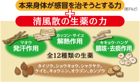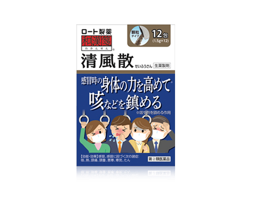 清風散には、風邪のひき始めから、こじらせた風邪までの症状を幅広くケアできるよう、カッコン、マオウをはじめとする生薬を全12種類配合しました。この12種類の生薬が咳や熱などの風邪の症状を鎮めます。