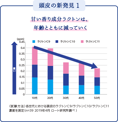 若い頃には頭皮中にも「ラクトン」がたくさん出ていたのに対して、30代以降にぐっと減少してしまうことがロート製薬の調査でわかりました。また、体からは検出されなかった新たな種類のラクトン「ラクトンC9」が頭皮から出ていることも発見できたのです。