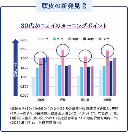 頭皮は髪の毛が密集した環境であることもあり、ニオイの原因が加齢臭だけではなく皮脂臭や汗臭、さらにはいわゆる靴下臭と同様の蒸れ臭など、色んなニオイが混ざっていて、それら全てのニオイが30代を境に強まることが確認されました。