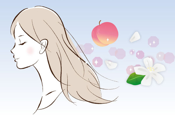 加齢によって減ってしまう甘い香り成分「ラクトン」。シャンプーとコンディショナーには「ラクトン」を含有する香料を配合しています。特にコンディショナーでは、この香りを長く続かせることが大切であると考えました。香りを長く続かせるために、単純に香料を大量に配合するだけではニオイがきつくなるだけなので、ふんわりとほのかに香る香りが続くことを目指しました。しかしこの目標の実現はとても難しく、基礎研究を続け、100処方以上試作を重ねた結果、やっと香りを持続させるコーティング技術を完成させました。この技術によって、若く女性らしい香りがふんわりと香り続けることを実現できたのです。